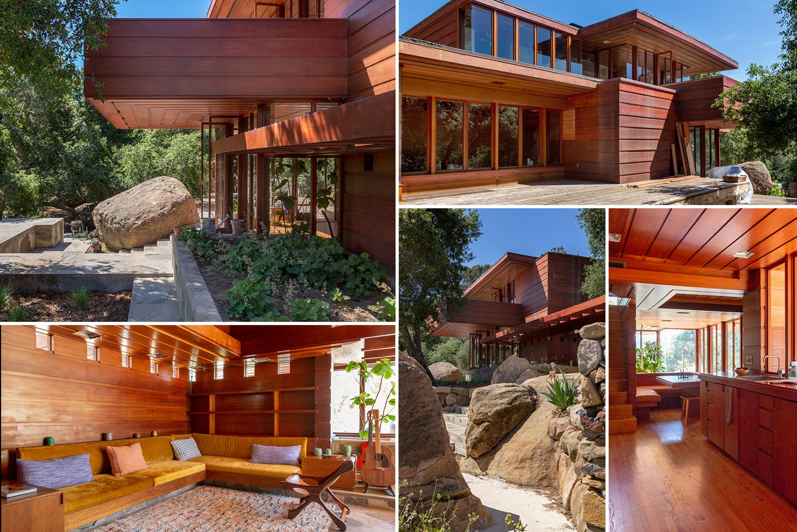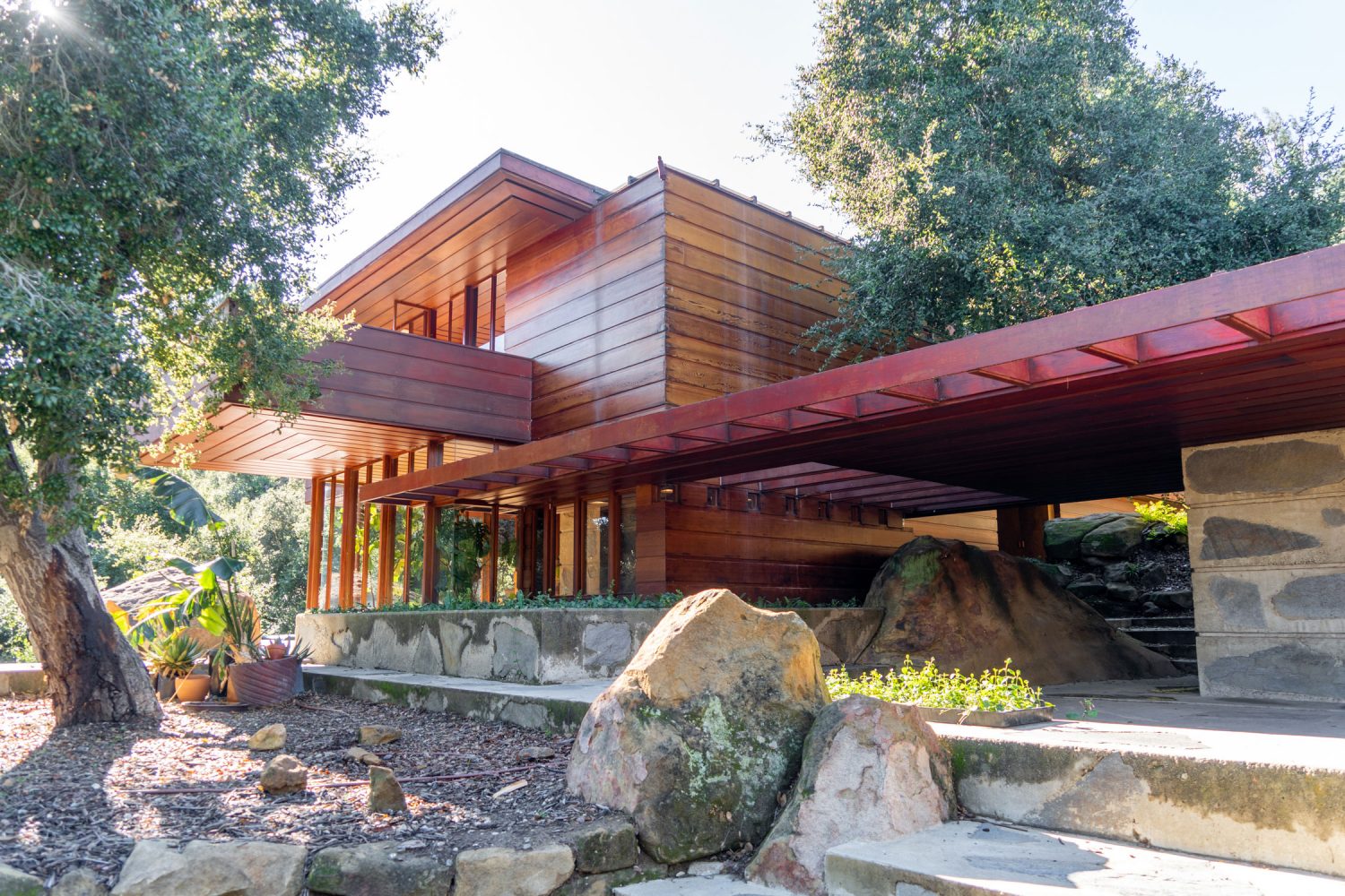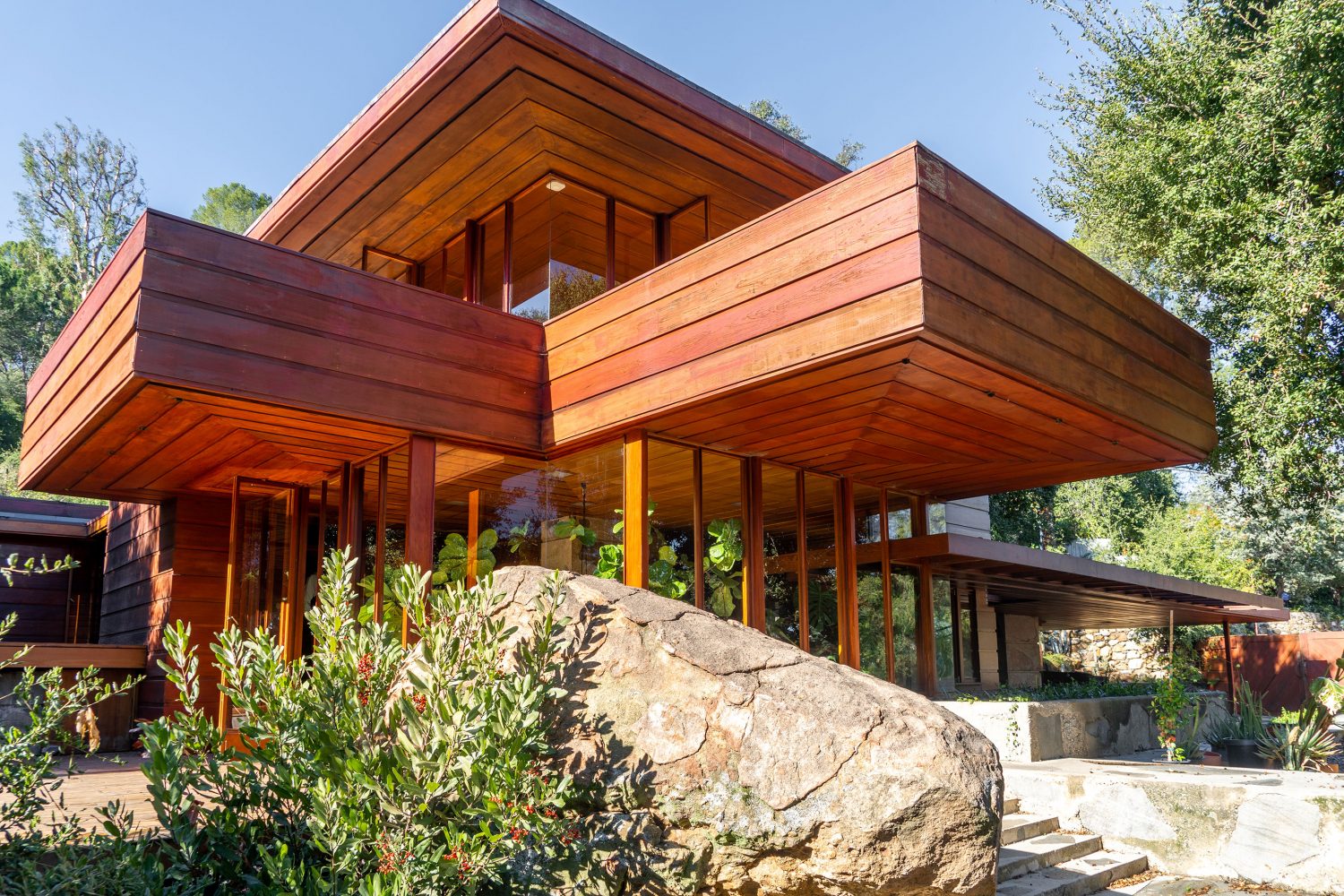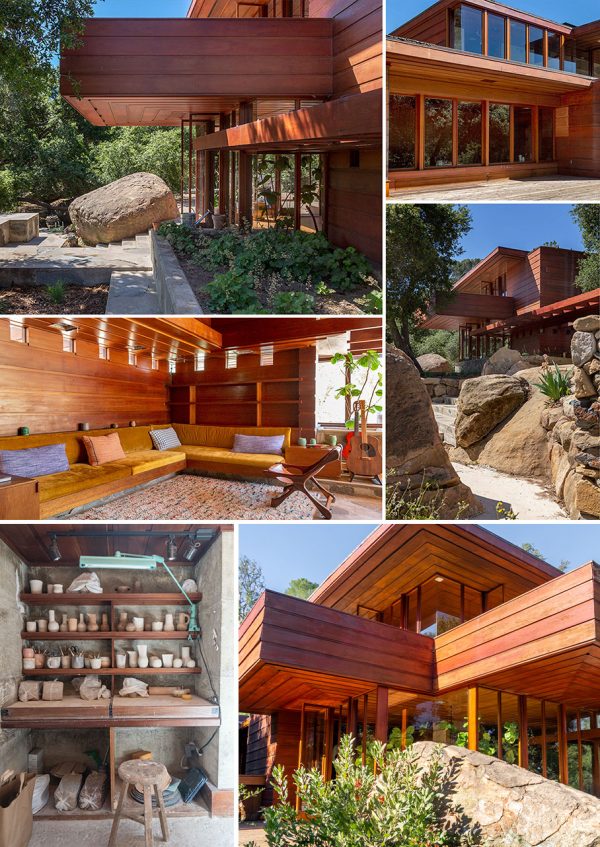 The exterior of the Anderson House features red-toned wood panels surrounded by natural boulders that are integrated into the lush Topanga landscape. The Anderson House is available for filming, photography/photoshoots, commercials, and high-end production.