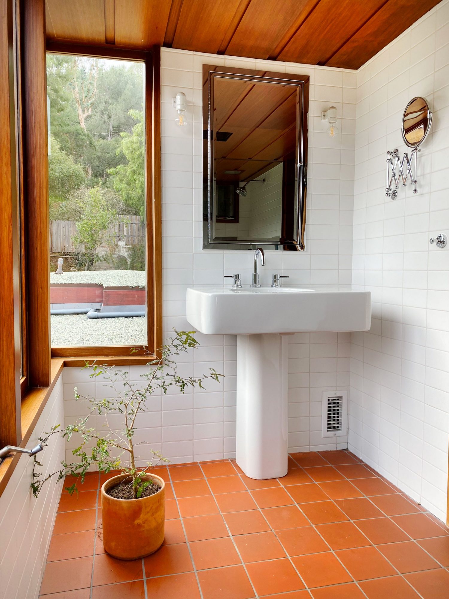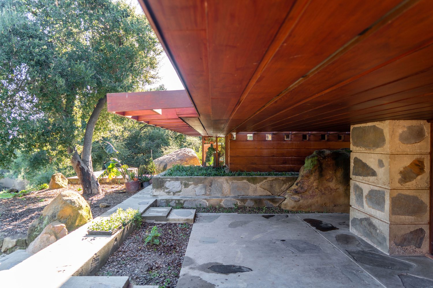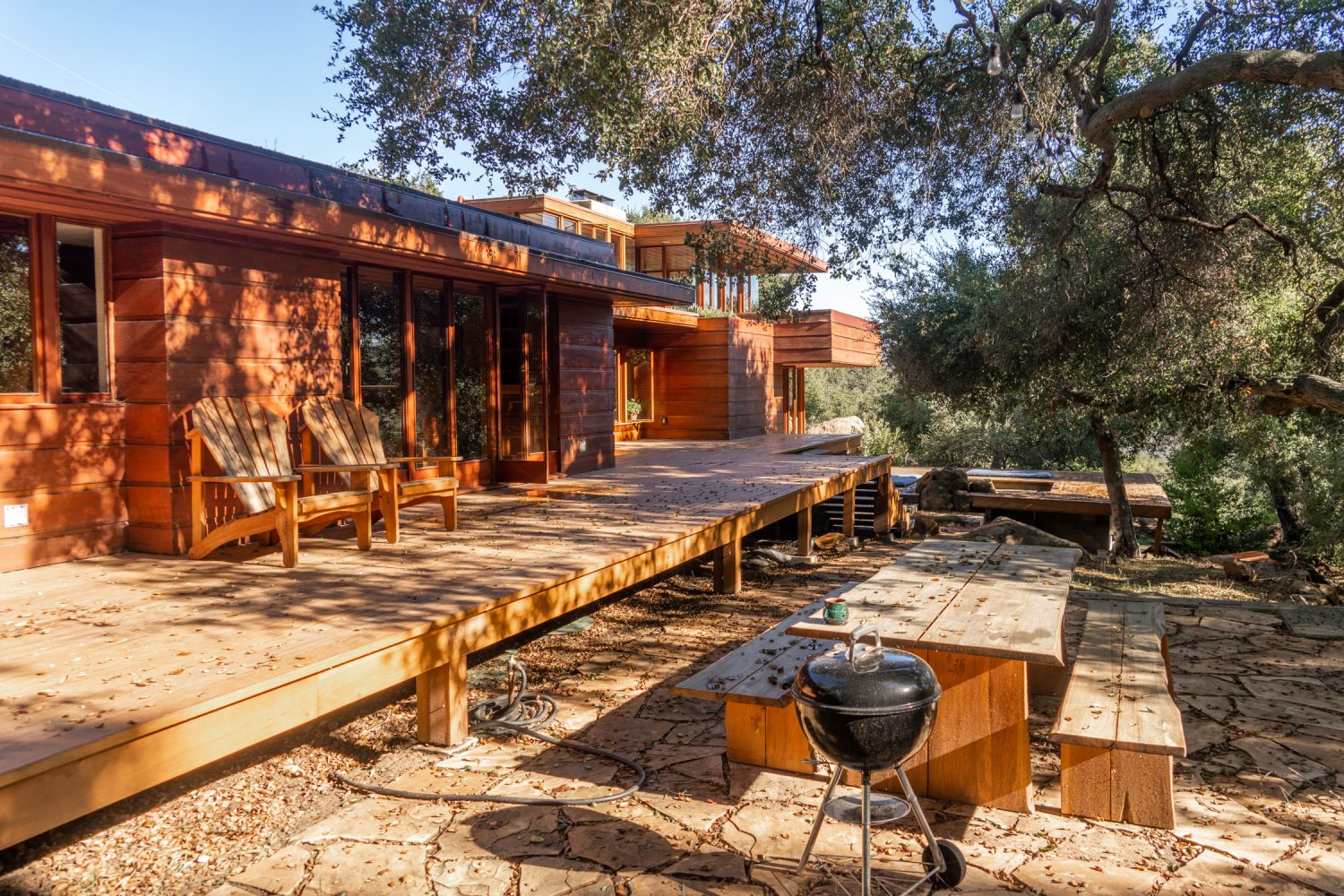 The exterior of the Anderson House features red-toned wood panels surrounded by natural boulders that are integrated into the lush Topanga landscape. The Anderson House is available for filming, photography/photoshoots, commercials, and high-end production.